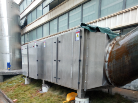 三、惡臭氣體利用排風設備輸入到本凈化設備后,凈化設備運用高能UV紫外線光束及臭氧對惡臭氣體進行協同分解氧化反應,使惡臭氣體物質其降解轉化成低分子化合物、水和二氧化碳,再通過排風管道排出室外。